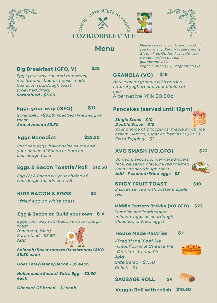 Step into Fozigobble Cafe, nestled at 79 Princes Hwy, Yarragon VIC 3823, where our menu is a delightful celebration of flavors that cater to every palate! From the hearty satisfaction of our Chunky Beef Pie and Chicken and Leek Pie to the refreshing zing of our Iced Coffee and Apple and Ginger Juice, there’s something to tickle your taste buds. For those seeking a lighter fare, dive into our Moroccan Quinoa Salad or savor the creamy goodness of our Smashed Avocado. Vegan diners can indulge in our Cauliflower Pie or Vegan Sausage Roll with Tomato Relish, while little ones will love our Kids Bacon and Eggs. Don’t forget to treat yourself to a sweet ending with our Raspberry Brownie or a delicious Mango Smoothie! Here at Fozigobble Cafe, we take pride in using locally grown fresh veggies to craft each dish with love. Come join us and discover your new favorite meal!